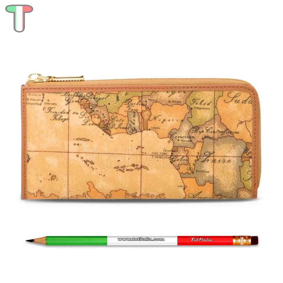 Manufacturer: Alviero Martini.  Line: Geo.  Functionality: women's wallet zip around . Two banknote compartments Eight credit card slots Four receipt compartments Zipped external coin pocket Snap button closure Cowhide leather details and inserts Matching color stitching and ribbing Embossed 1ª Class logo Mixed cotton blend lining, customised with 1ª Classe logo 15 µm gold finish protected metal parts customised with 1ª Classe logo.  Material: genuine leather.  Polyvinyl Chloride (PVC).  Color: brown.  Warranty 2 years.  Dimensions: 19.5x10x2 cm.  Weight: 0.3 kg.