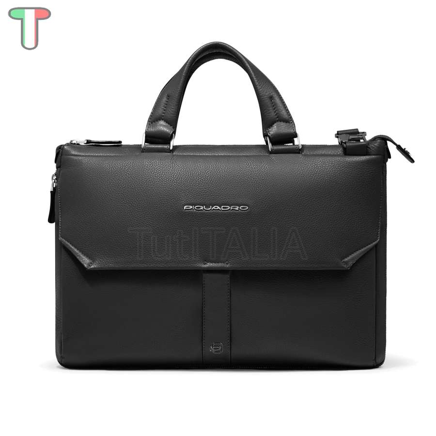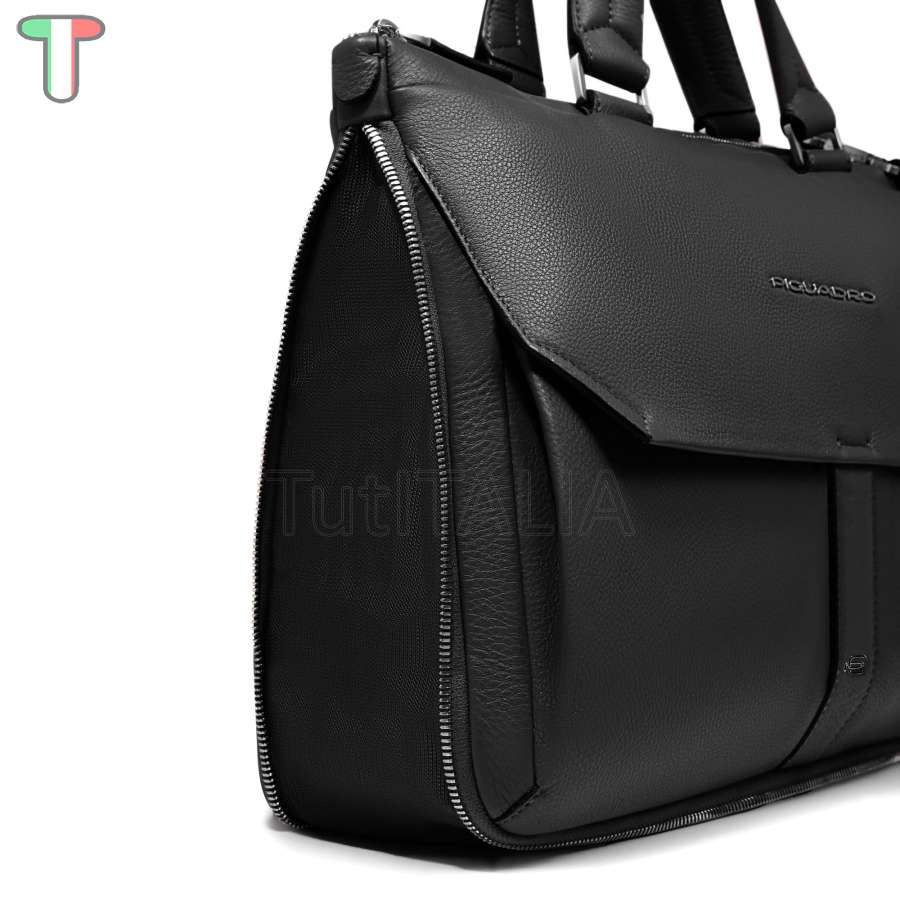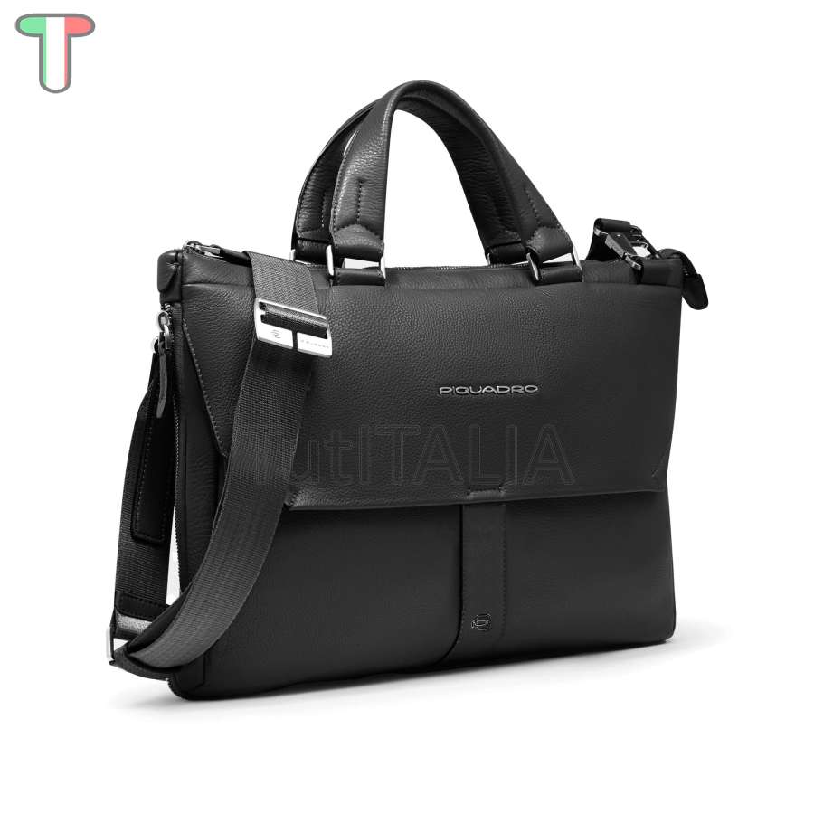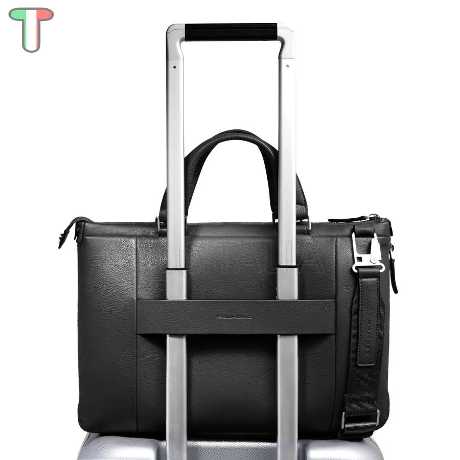 Manufacturer: Piquadro.  Functionality: men's bag.  Material: leather.  Color: black.  Included shoulder strap.  Number of compartments: 1.  Shoulder strap: detachable.  Can contain: 14" laptop.  PC holder features: Shock Absorber.  Support iPad® 10,2''Air 10,9''Pro 11'': not removable.  Internal lining: 100% polyester.  Handle type: sewn.  Pockets for induction charging: yes.  Power bank pocket: yes.  AirPods® pocket: yes.  Right and left single-shoulder portability: yes.  Security system: Zipper join with passes.  Expansion system: yes.  Dimensions: 37x26x4 cm.  Height of handle: 13 cm.  Weight: 1.05 kg.